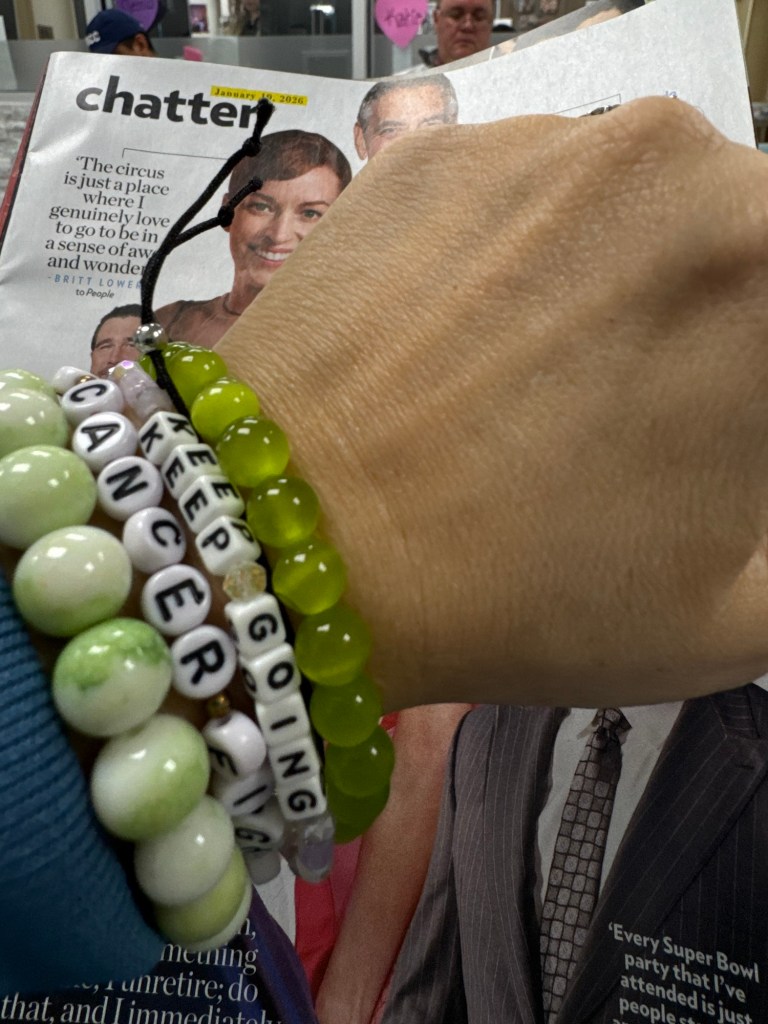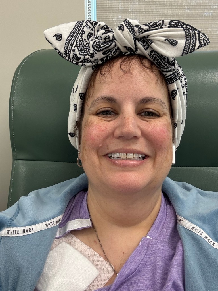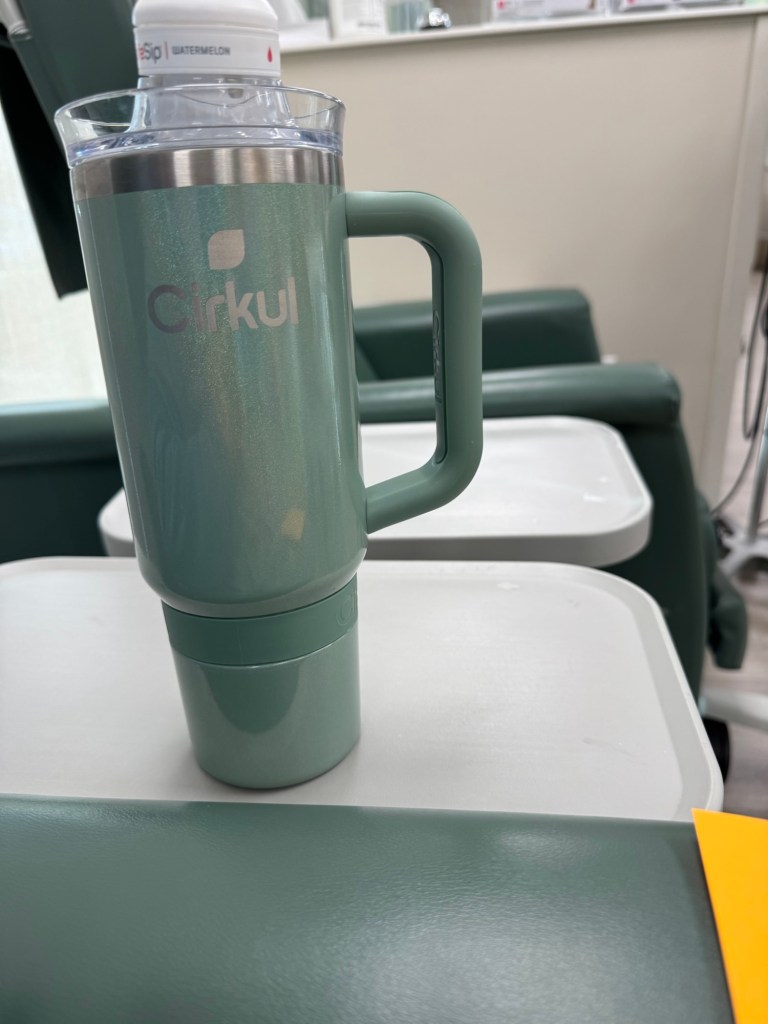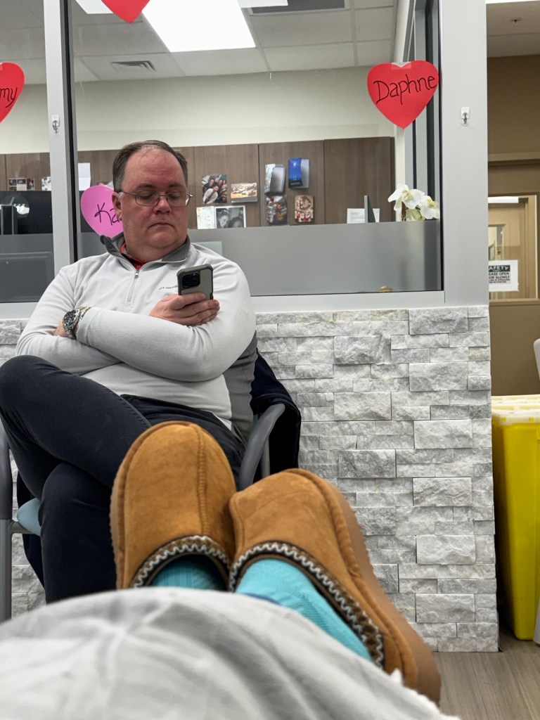 So, once my bloodwork comes back and I’m cleared for chemo to begin, we start with premedications- Tylenol, 2 IV antinausea medications, IV steroids and IV benedryl. Then we get to the good stuff. The outpatient regimen is slightly different than the one I received as an inpatient. Because of that, the first outpatient infusion goes a little slower. Since it was my first time as an outpatient, I got to keep my emotional support human with me. Very handy as I had him to refill my water and fetch my snacks.