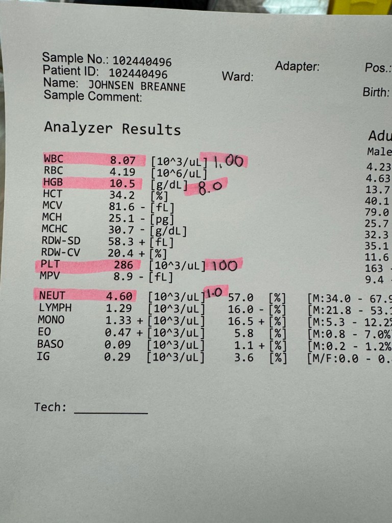 Today was my first treatment as an outpatient. This time I got all my chemo in one day for the first time. First I get bloodwork to make sure my numbers are at an acceptable level to proceed.