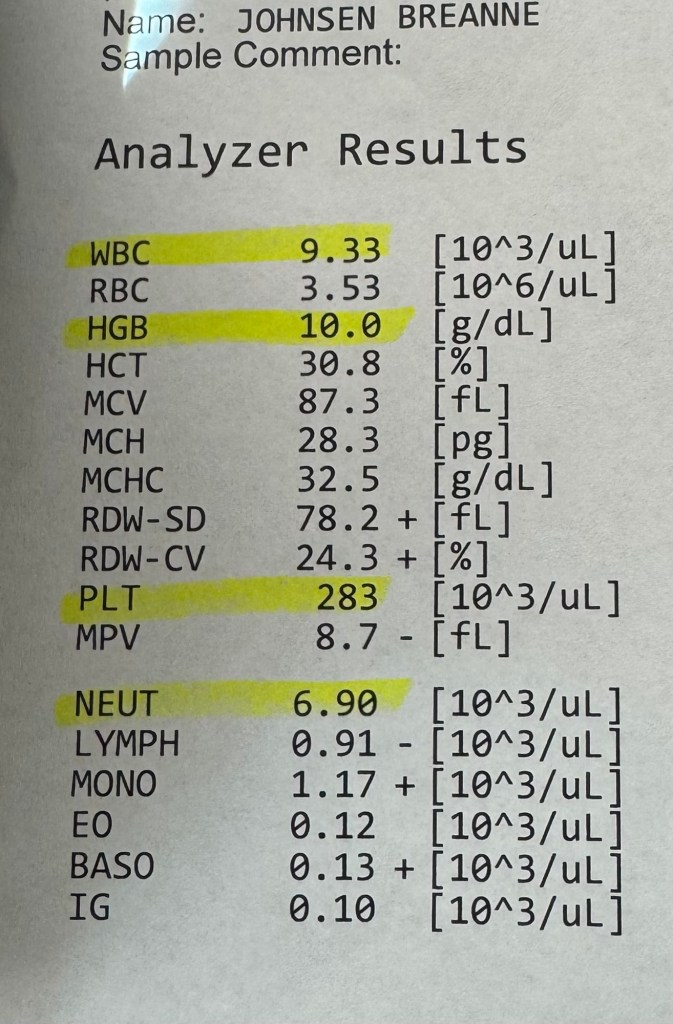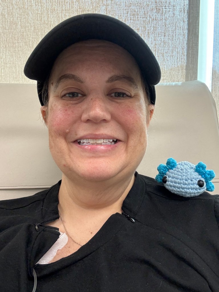 This time I brought my emotional support axolotl that my sweet friend crocheted for me. Axolotls are apparently self-healing, so it felt appropriate to bring him along for chemo. I got an 8 am start time this time and my port cooperated so the blood draw went well and my numbers came back good to go. Everything went well and we were able to proceed at full speed on all my infusions, so I only spent 6 hours there instead of 8. I still napped there and when I got home.
