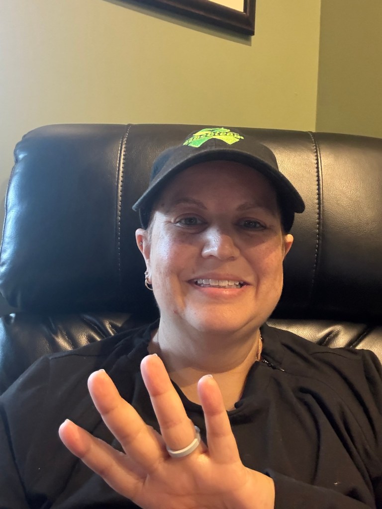 Are you singing the song? Because I am. We have officially reached the halfway point of treatment today. Four infusions down, four to go. This was my first official outpatient infusion on my own. My emotional support human was able to walk back and carry my bag of stuff and to bring me lunch.